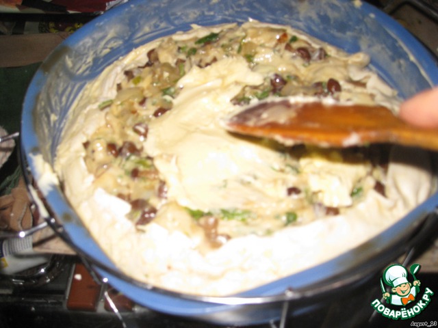 7. В одной миске смешать грибы, лук и порезанную петрушку, туда же добавить сырно-молочную массу.