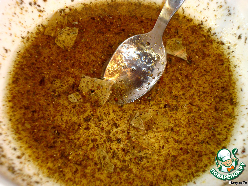 Пока ушки остывают, приготовьте маринад. Смешайте масло, уксус, кориандр, перец, паприку, базилик, измельченные лавровый лист и чеснок. Добавьте сахар (1 ч.л.) и соль по вкусу.