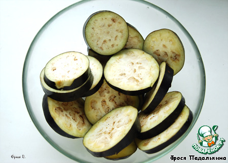 Итак, баклажан нарезаем кружками, посыпаем солью, оставляем на 15-20 минут. Можно небольшую полоску кожуры оставить для украшения.