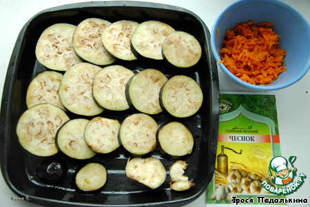 Баклажаны промываем холодной водой, откидываем на дуршлаг, даем воде стечь. Выкладываем на смазанный маслом противень, посыпаеи сушеным чесноком. Запекаем при 180 гр до готовности, примерно 15-20 минут.