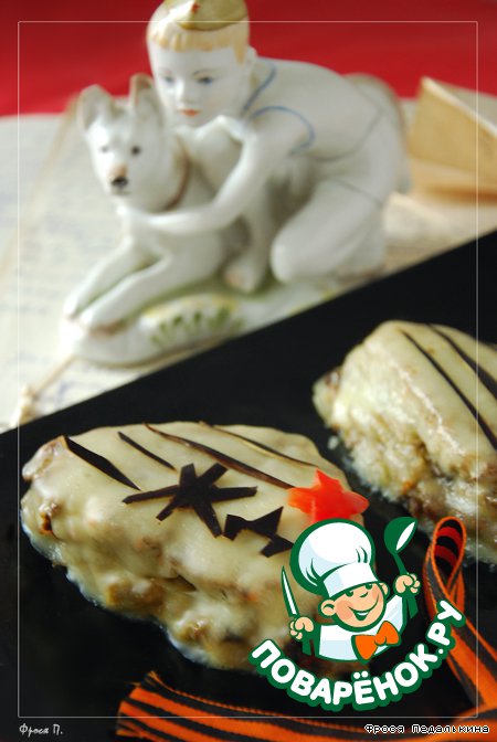 Из кожуры баклажана вырезала надпись "Жди..", тонкие полоски - адресные строчки. Из красного перца - звездочку, символизирующую штамп полевой почты.