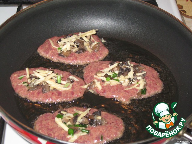 | Всем знакомые котлеты из печени с начинкой из грибов, сыра и зеленого лука. Очень пикантно. |