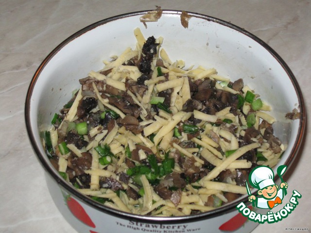 Печень перемолоть с луком. Добавить соль, специи, яйцо и муку. Грибы поджарить с луком, добавить зеленый лук и тертый сыр. На сковородку выложить лепешки печеночного фарша, а на них смесь из грибов и сыра. Эту смесь покрыть печеночным фаршем и жарить до готовности.