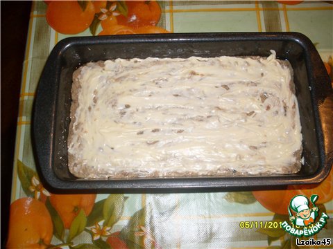 Выложить в смазанную растительным маслом форму. Верх смазать сметаной.