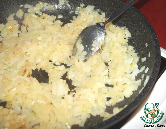 Лук режем небольшими квадратиками и жарим до золотистого цвета.