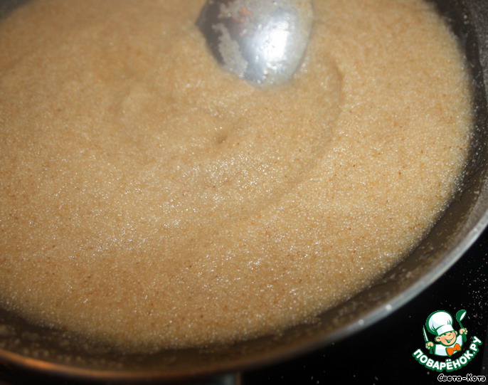 На сухую сковородку насыпаем манку и прожариваем до светло-коричневого цвета, затем добавляем воду, при этом помешивая, чтобы получилась густая каша (воды примерно 200 мл)