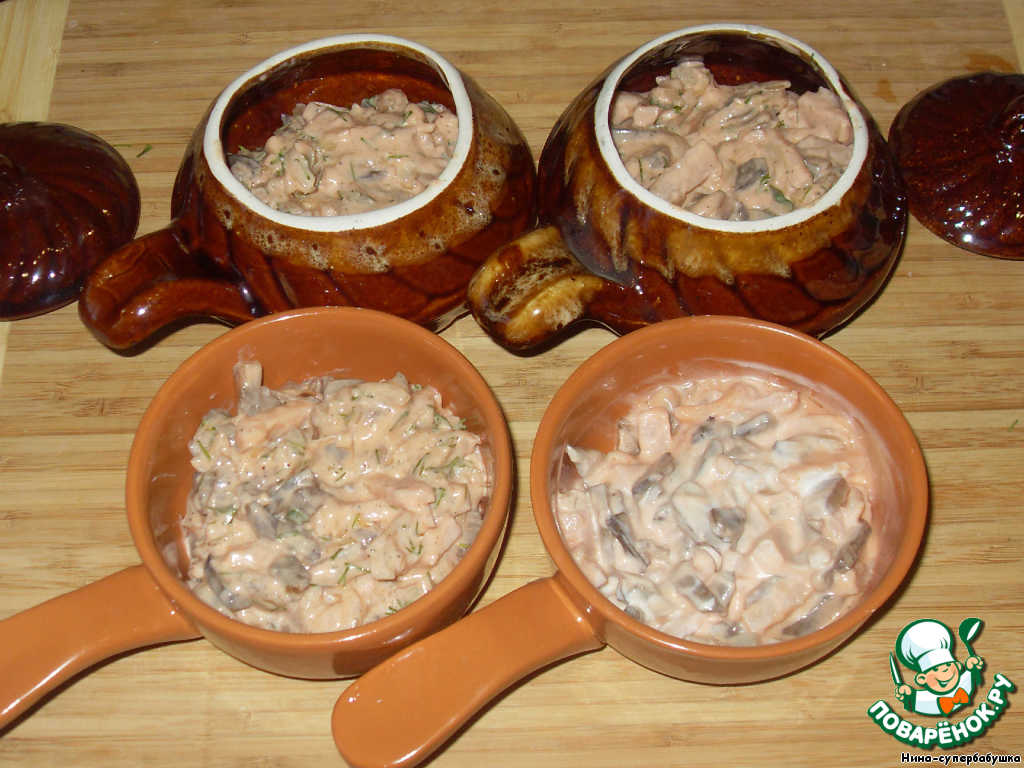 А вот муж и мама предпочли выложить жюльен на тарелочки и съесть с картофельным пюре (к которому я, вообще-то, пожарила котлет! Но, они остались на сковородке невостребованными!)