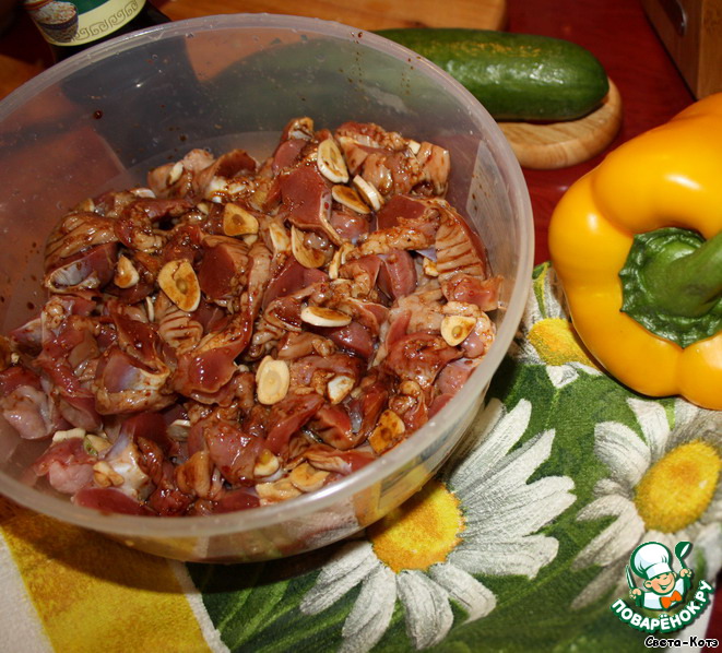 Тщательно промываем желудочки. Нарезаем их вдоль на 3-4 части. Полукольцами рубим чеснок.