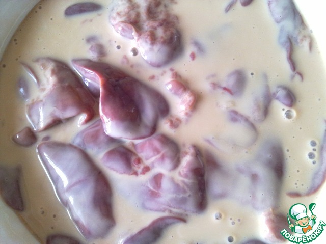 Куриную печень промыть и замариновать в смеси кефира и соевого соуса на 1 час.