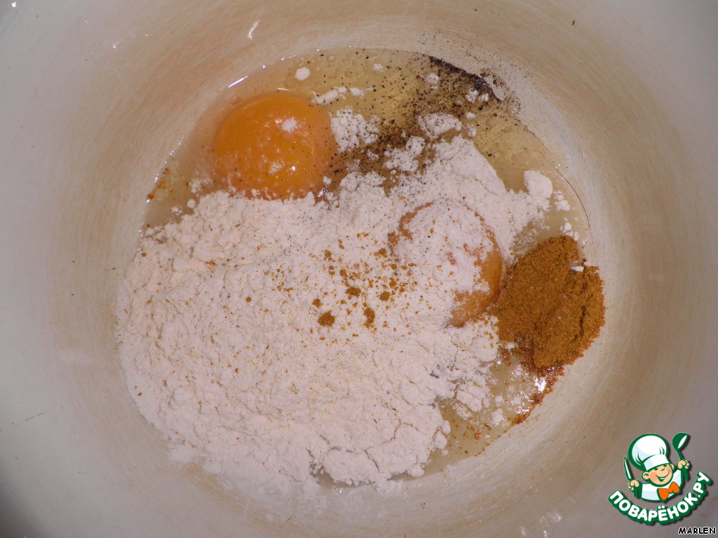 Приготовим кляр. Смешаем яйцо, муку, карри, соль и перец.