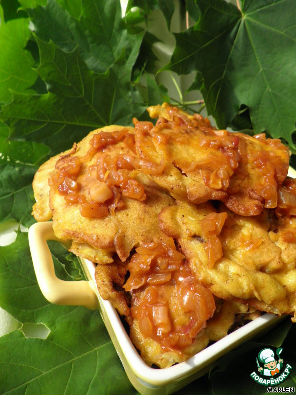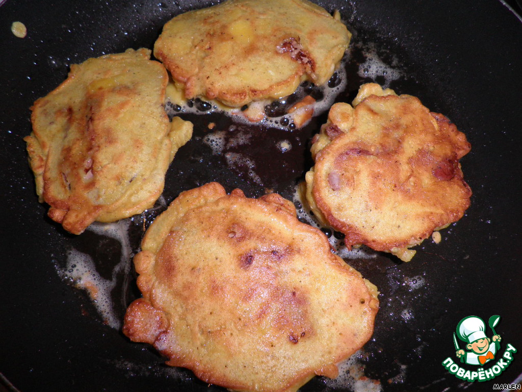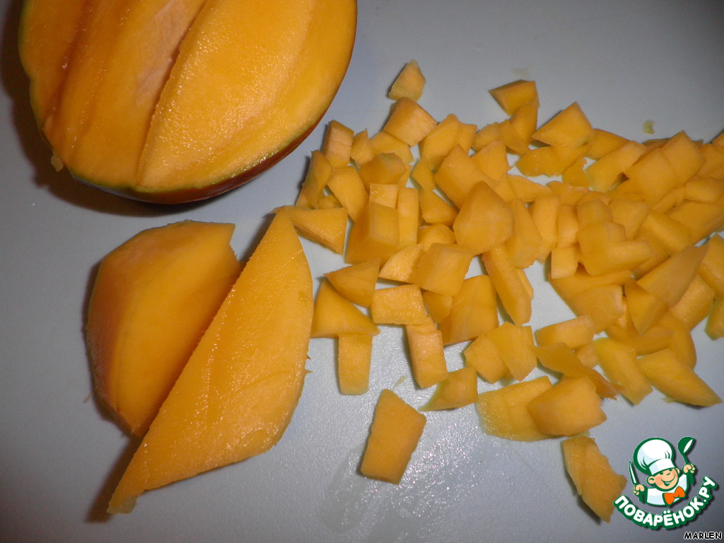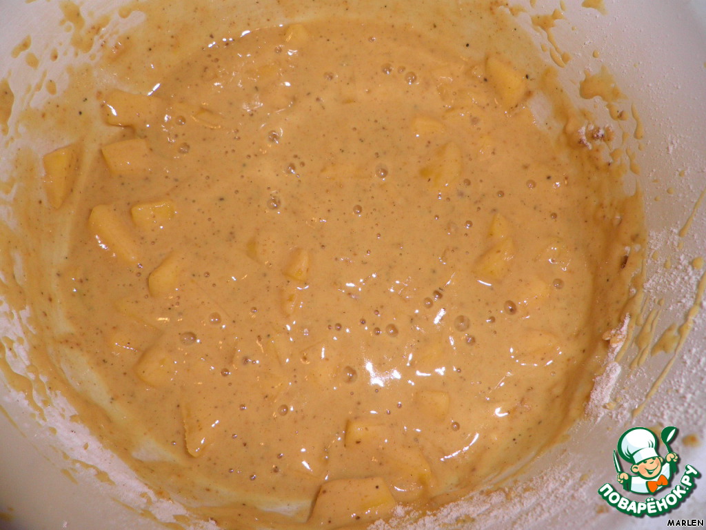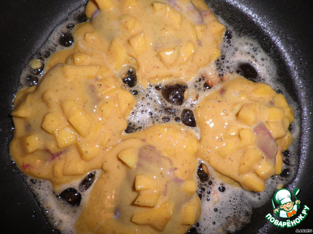 В готовый кляр дабавляем нарезанное манго и перемешиваем. Можно все ингредиенты измельчить блендером до однородной массы, но я решила приготовить кляр с кусочками манго.