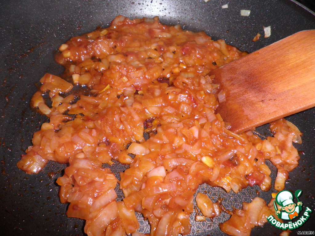 При желании можно приготовить соус. Для этого очищенный лук мелко нарезать и пассеровать на масле, потом добавить томат пасту, соевый соус и сок лимона, тушить 5 минут, посолить по вкусу. Если хотите, чтобы соус был немного жидковатым, добавьте немного воды.