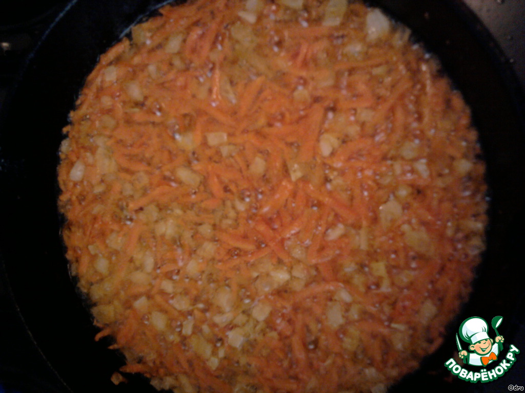Лук мелко нарезать, морковь натереть на тёрку и обжарить в подсолнечном масле.