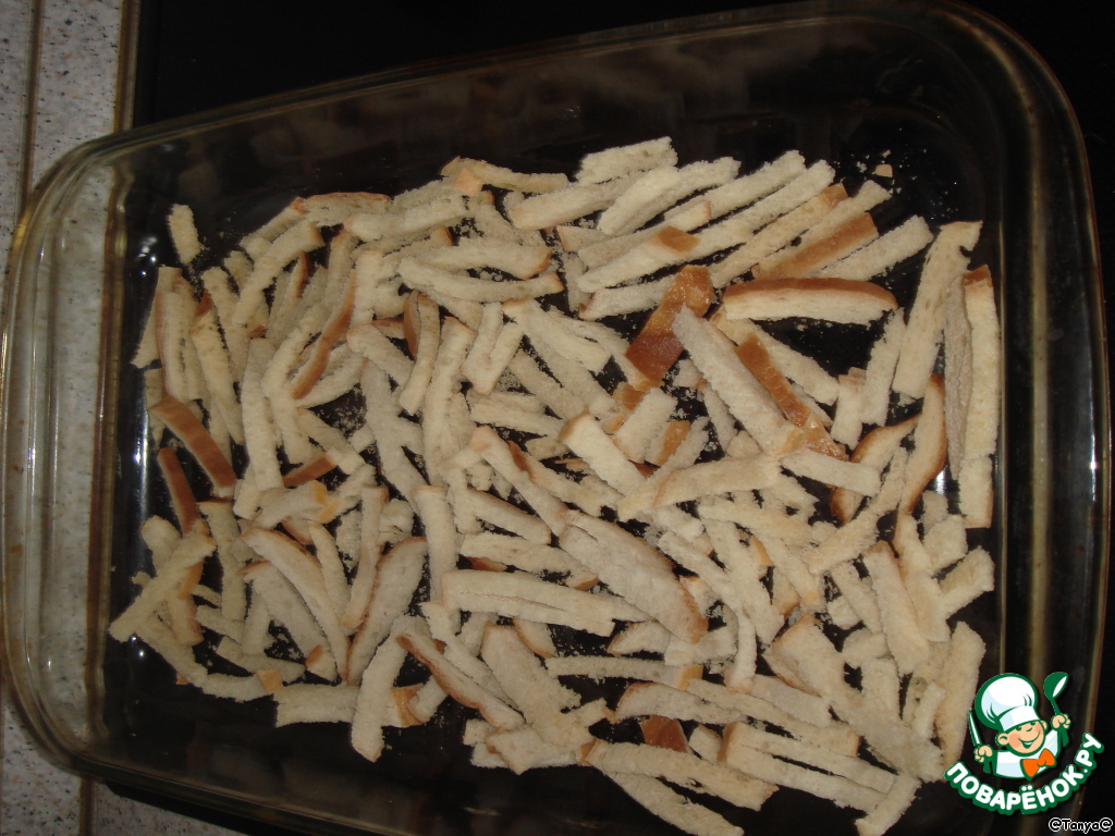 3-4 кусочка батона нарезать тонкой соломкой и немного подсушить в духовке.
