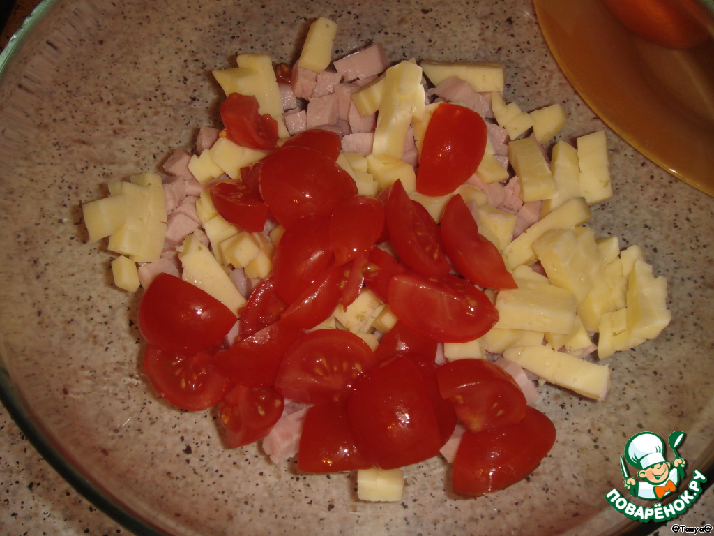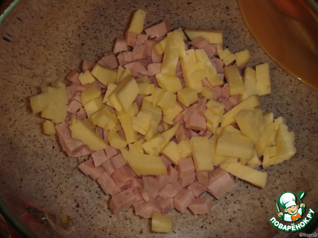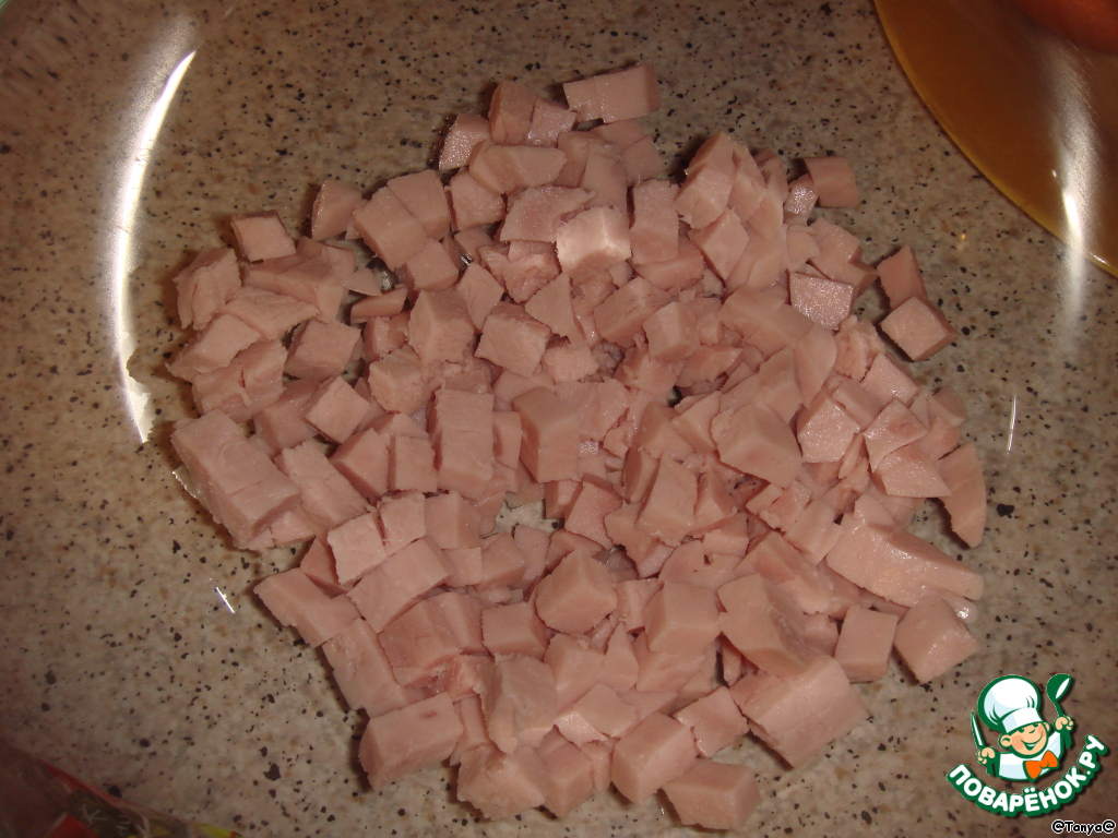 Ветчину нарезать маленькими кубиками.