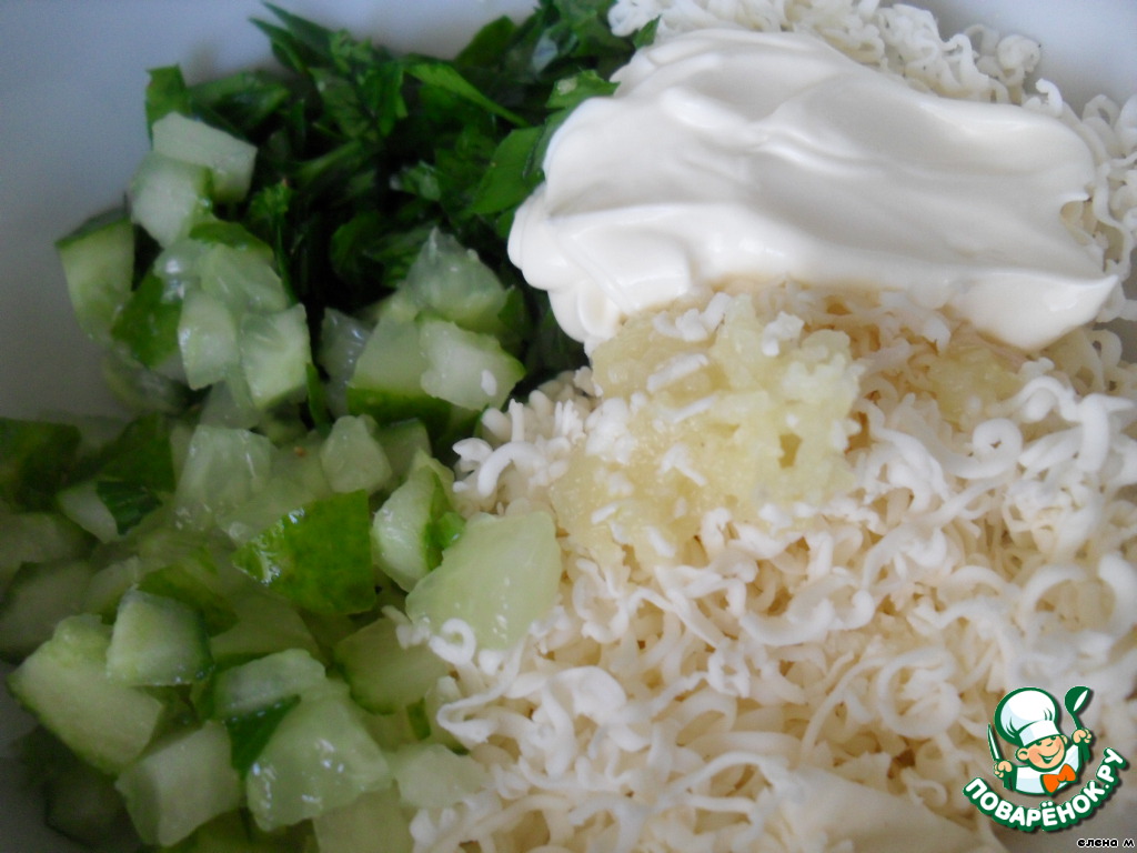 Выдавить через пресс чеснок.