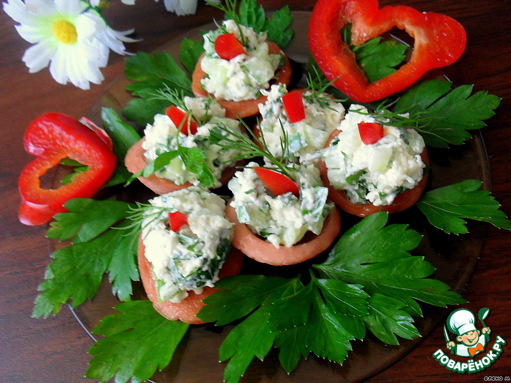 Наполнить "тарелочки" салатом, украсить болгарским перцем и зеленью укропа.