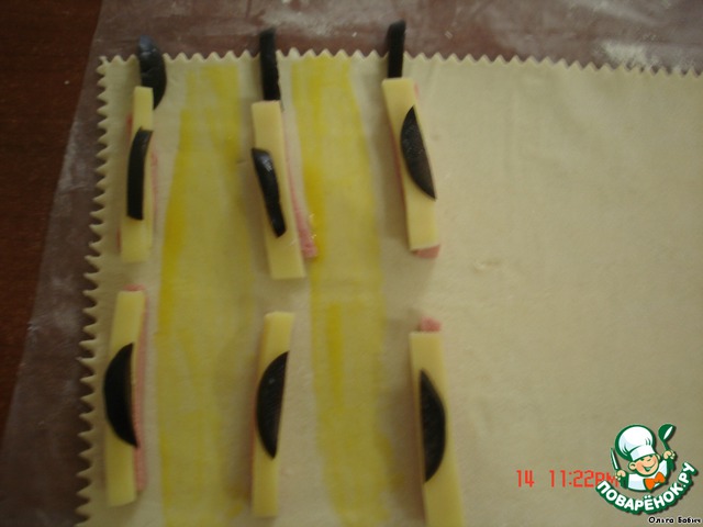 Укладываем на тесто, предварительно его раскатав, ветчину, сыр, сверху маслинки, кусочек маслинки оставляем немного за пределами теста, промазываем промежуток желтком