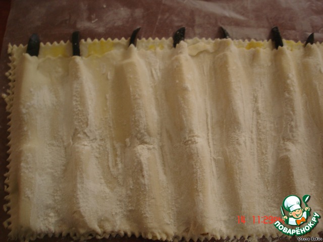 Разрезаем, смазываем желтком и укладываем на противень, застеленный пекарской бумагой.