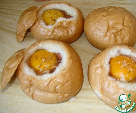 Затем собираем наши булочки. В каждую булочку выкладываем сначала сыр, затем обжаренные сосиски. Сверху осторожно выливаем сырое яйцо. Солим и перчим по вкусу, учитывая что булочки, сыр и сосиски уже соленые. Прикрываем каждую булочку, своей срезанной "крышечкой".