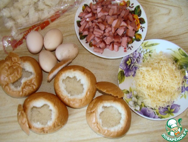 Подготавливаем наши ингредиенты. У булочек срезаем "крышечку", вынимаем мякиш, оставляя стенки около 1 см. Сосиски или любые колбасные изделия режем произвольными кусочками и обжариваем (не обязательно). Сыр натираем на мелкой терке.