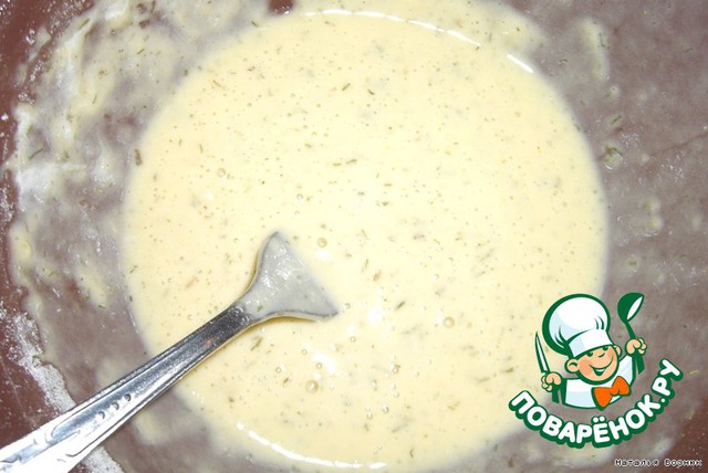 Яйца взбиваем с солью, добавляем сметану, муку - хорошенько взбиваем