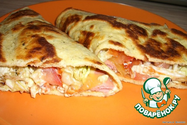 складываем пополам и ставим в свч на минутку, чтобы сыр расплавился,