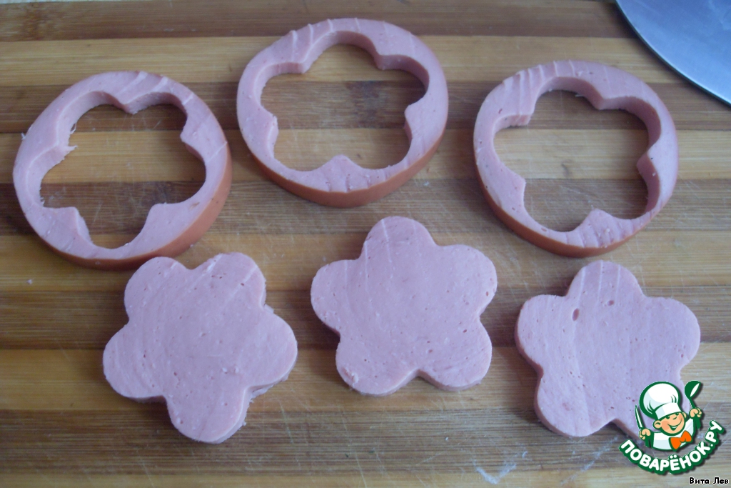 С помощью формочек для печенья вырезаем цветочки из колбасы (оставшиеся окружности не выбрасываем, они нам пригодятся в другом блюде).