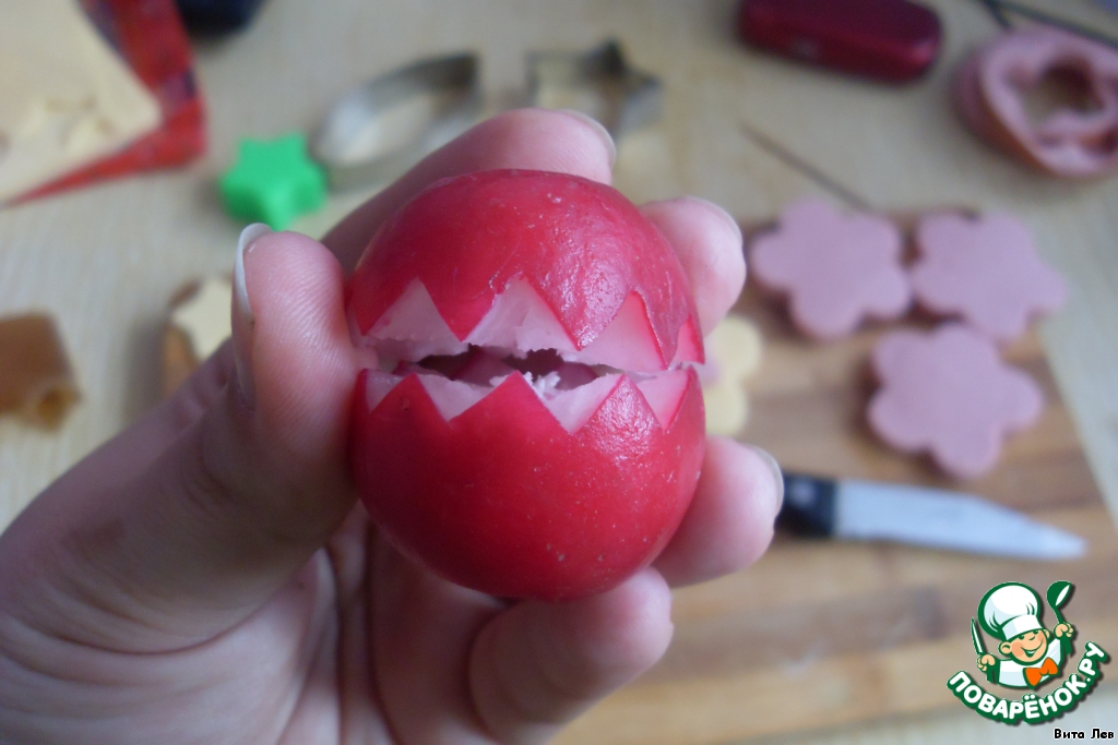Редис разрезаем зигзагом с помощью маленького ножа.