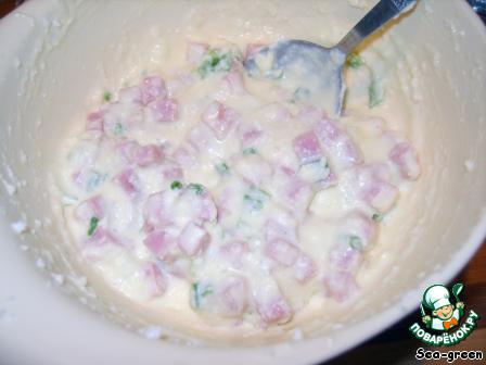 Ветчину и лук мелко нарезать, добавить к масляной смеси, немного посолить.