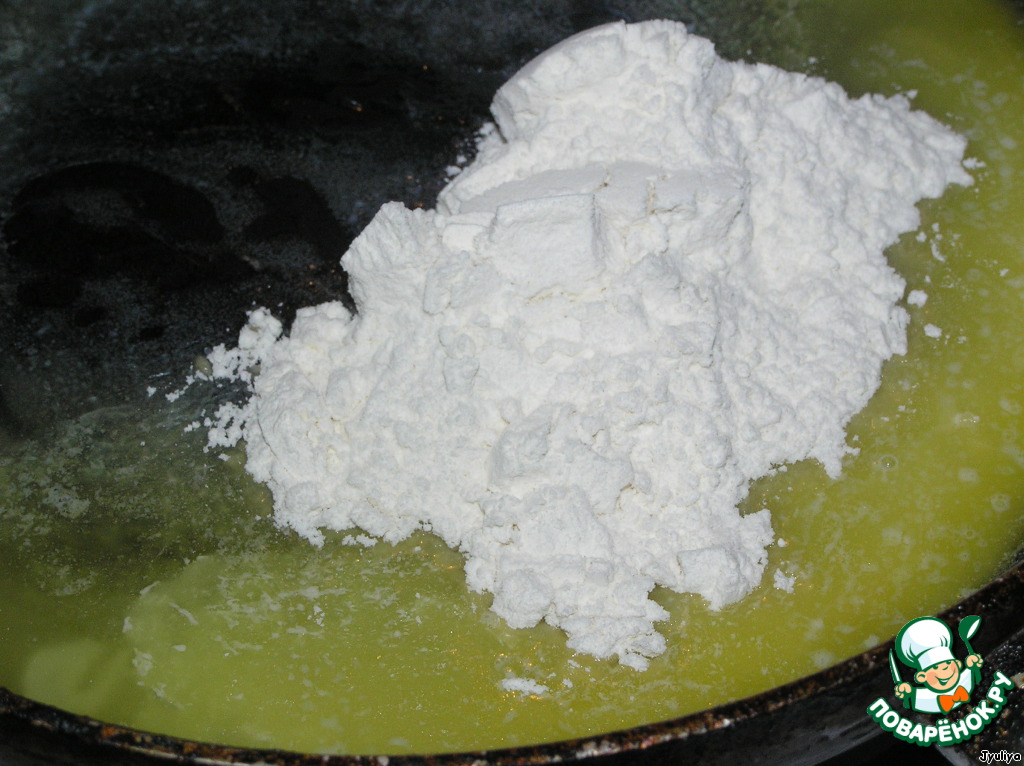 Приготовим густой соус бешамель: масло сливочное растопить, добавить муку, перемешать.