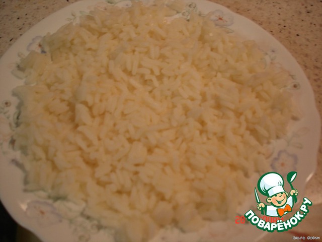 Рис уложить на блюдо, сверху майонез, ветчина, майонез, помидоры, огурчик, промазать майонезом и все присыпать рисом.