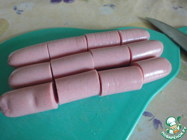 Далее режем сосиски. Т. к. у меня ганноверские, а они достаточно длинные, я режу их на 4 части. Обычные сосиски, я думаю, надо резать на части 2-3. Примерно должны получиться вот такие кусочки.