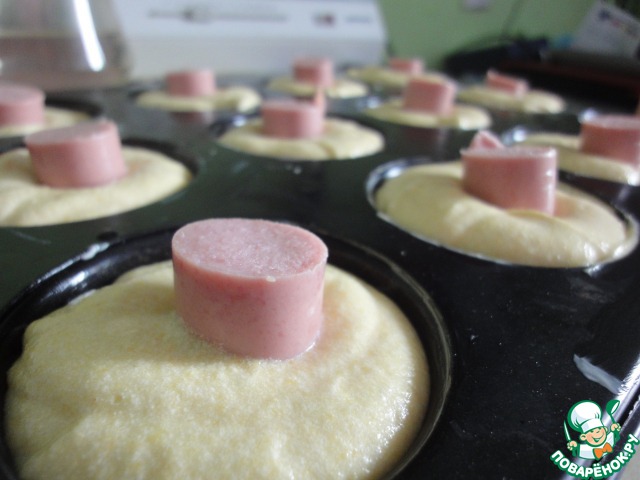 Кладем в каждую формочку по кусочку сосиски, немного утопив ее в тесте.