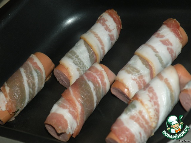 Одного пласта бекона мне хватило, чтобы завернуть 2 сосиски… ничем не закалывала…