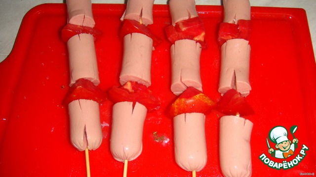 Сосиску разрезать на три части, с обеих сторон сделать надрезы крест на крест,