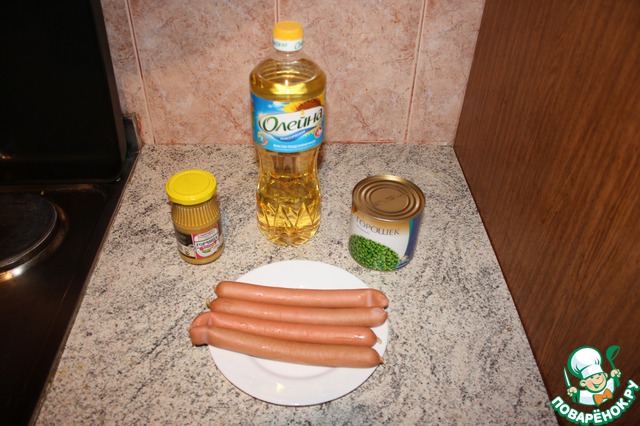 Для закуски надо: сосиски в натуральной оболочке, горошек консервированный, горчица и масло растительное для жарки.