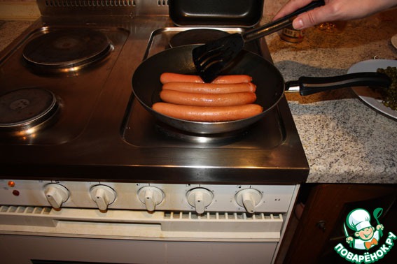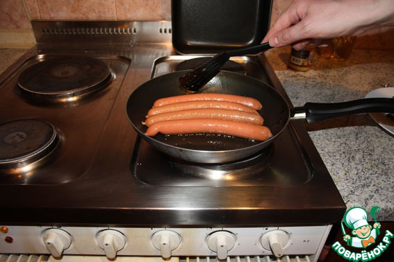 Начинаю жарить сосиски.
