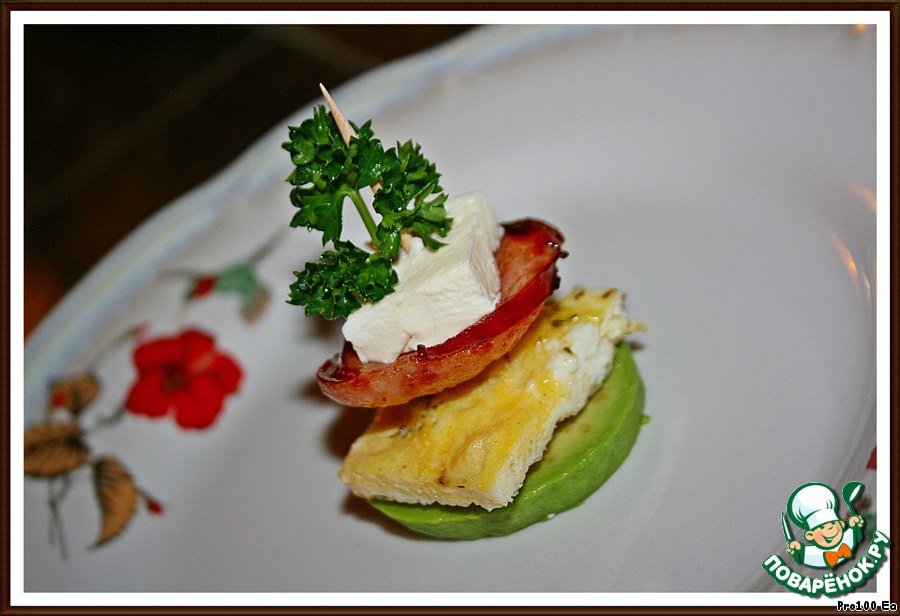 Когда все готово, при помощи зубочисткe соберите вот такую закуску: брынза, колбаска, омлетик и кружок авокадо! Украсьте зеленью.