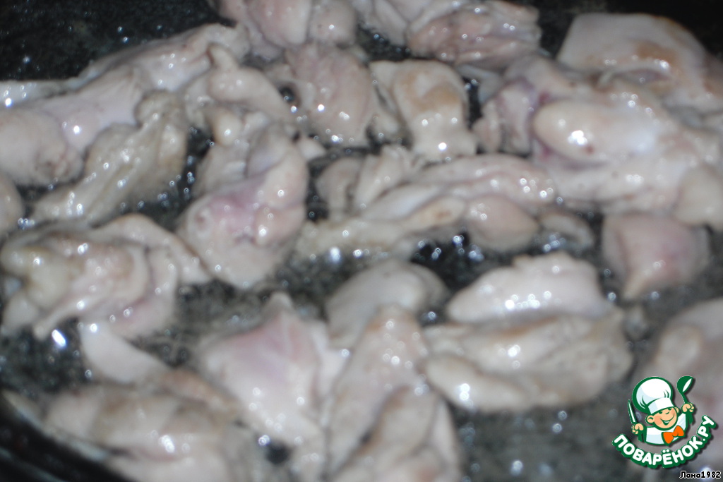 Куриное филе порезать на полоски. Посолить и поперчить. В сковороде на сильном огне разогреть растительное масло и обжарить мясо до готовности. Оставить остывать до теплого состояния.
