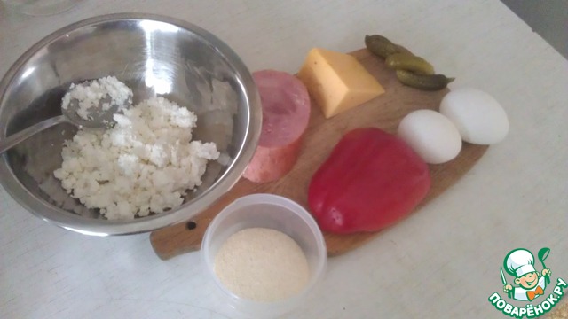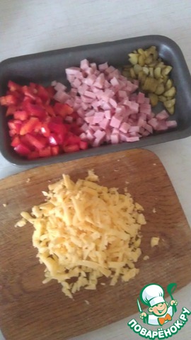 Болгарский перец очистить от семян и плодоножки, нарезать небольшими кубиками. Тоже самое проделываем с солеными огурцами и ветчиной. Плохо, что мысль, добавить зелень петрушки и укропа, пришла мне слишком поздно, а то вкус получился бы интереснее. Сыр натираем на терке, лучше на мелкой, хотя и с крупными кусочками тоже хорошо.