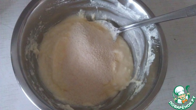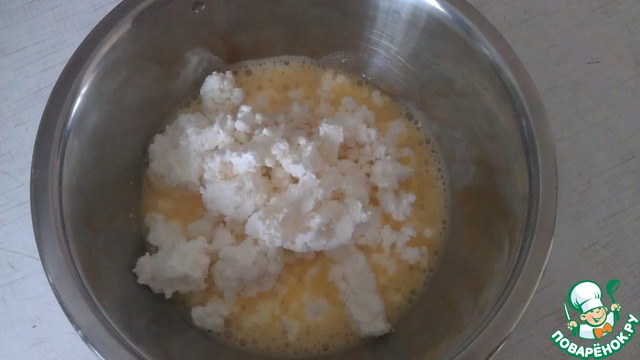 Добавляем творог и тщательно растираем его с яйцами (вот тут-то я и поняла, что все-таки миксер был бы не лишним). Творог я брала рыночный развесной, поэтому перетирала комочки, можно взять пастообразный и тогда эта процедура нам не понадобится.