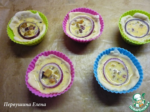 Наполнить тарталетки начинкой, оставив 0,5см сверху свободного теста.