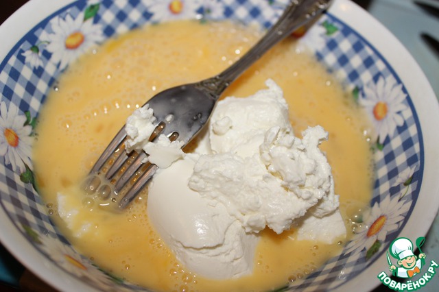 Отдельно взбить яйца и добавить к ним творожный сыр, перемешать.