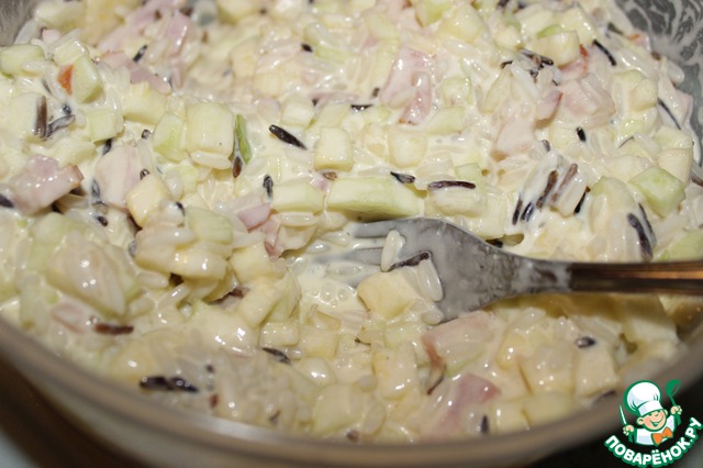 Рис отварить до готовности в подсоленной воде. Кабачок очистить от кожуры и мелко нарезать. Корейка (копченая) также нарезается мелко. И все эти ингредиенты перемешиваем.