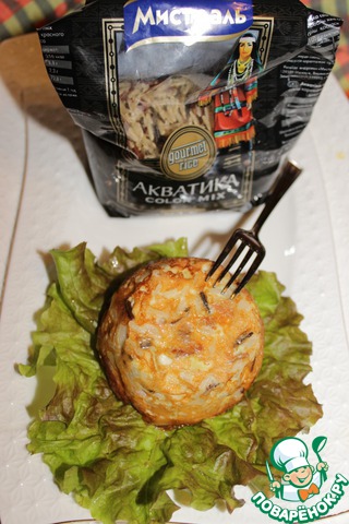 Теперь к рису добавляем яичную смесь, солим, перчим и тщательно перемешиваем. Можно добавить измельченную зелень укропа.