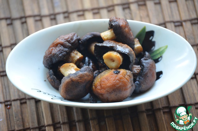 Грибы вымыть, обсушить, замариновать в маринада Терияки Blue Dragon 20 мин. Затем обжарить целиком на растительном масле. Сковороду накрыть крышкой и оставить до полного остывания. Репчатый лук мелко нарубить, зеленый лук нарезать колечками. Репчатый лук обжарить на растительном масле до прозрачности. Затем смешать с зеленым луком.