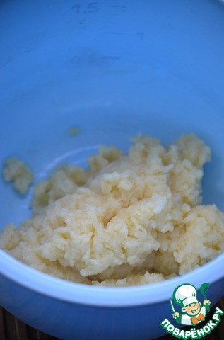 Кастрюлю снять с огня, переложить содержимое в миску и по одному добавить яйца, каждый раз перемешивая тесто при помощи миксера. В тесто добавить обжаренный лук, посолить и поперчить. Сыр натереть на крупной терке и перемешать его с тестом.
