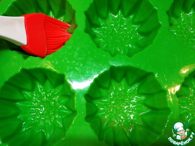 Слоёное тесто слегка раскатать и нарезать на квадраты по размеру формы. Если Вы, как я, взяли тесто фило, то его нарезать на квадраты из расчёта 4 квадрата на одну формочку.