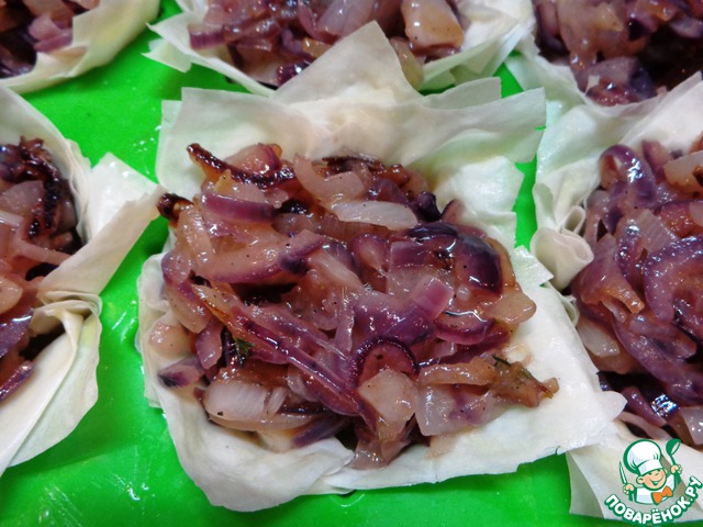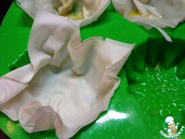 В каждую формочку выкладываем квадрат теста (если фило: 2 квадрата, промазать маслом, опять 2 квадрата, опять маслом), хорошо прижимаем.